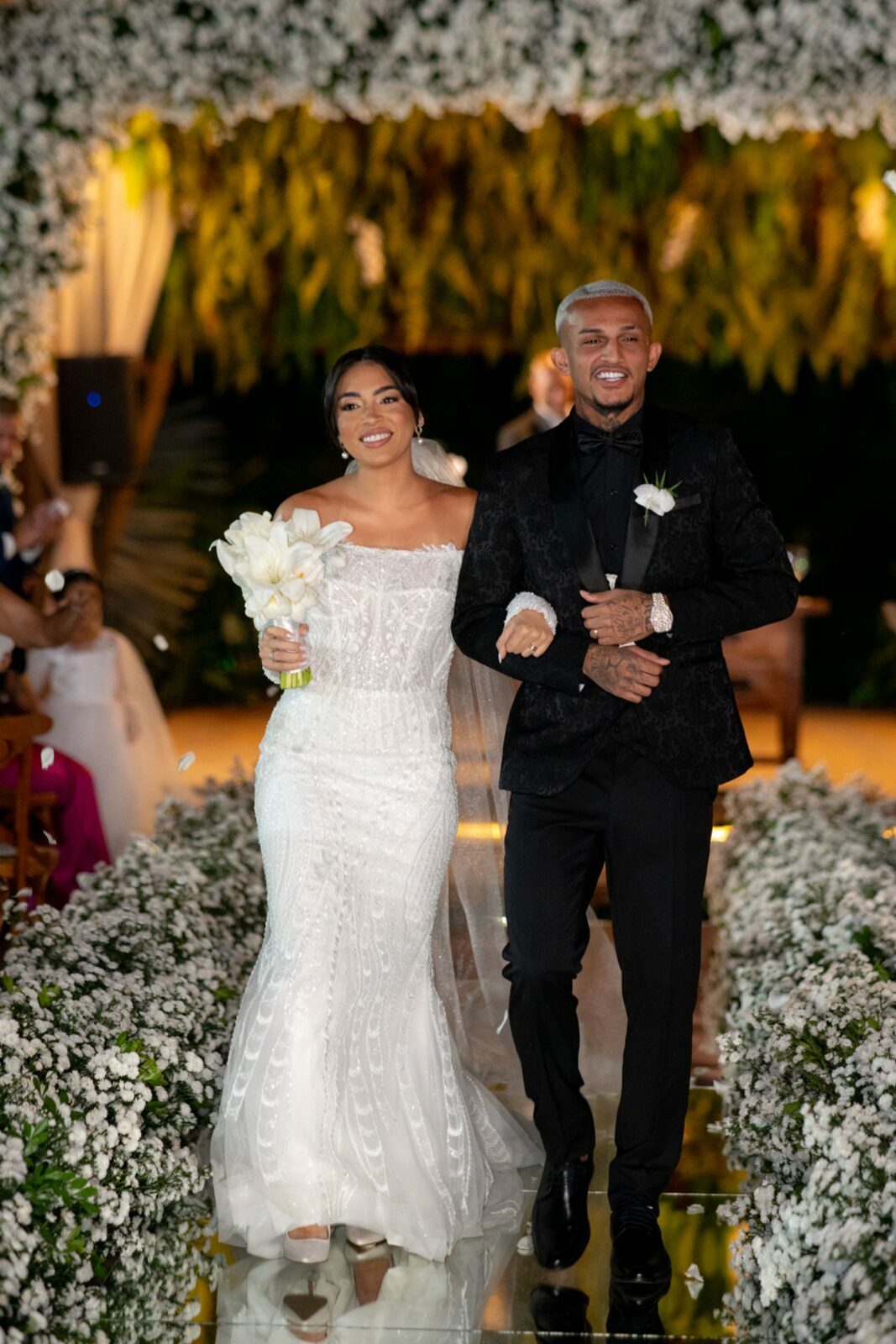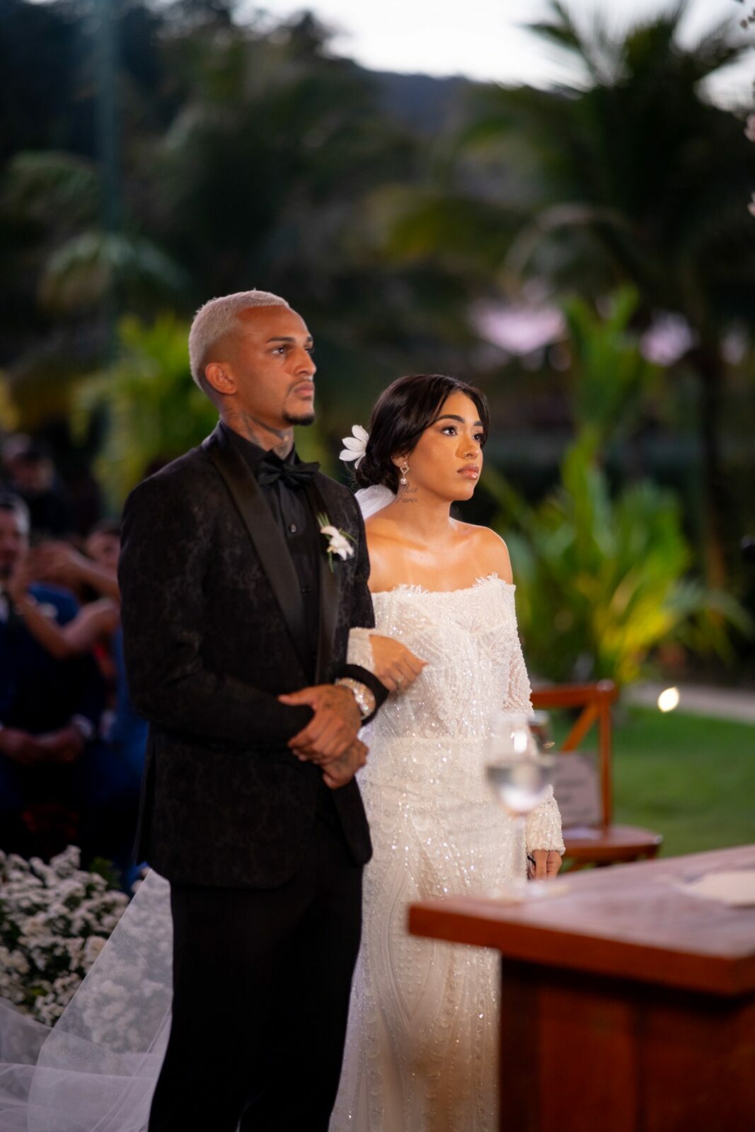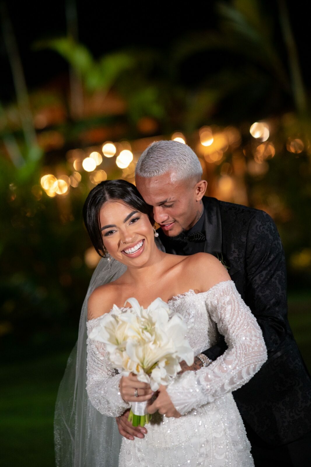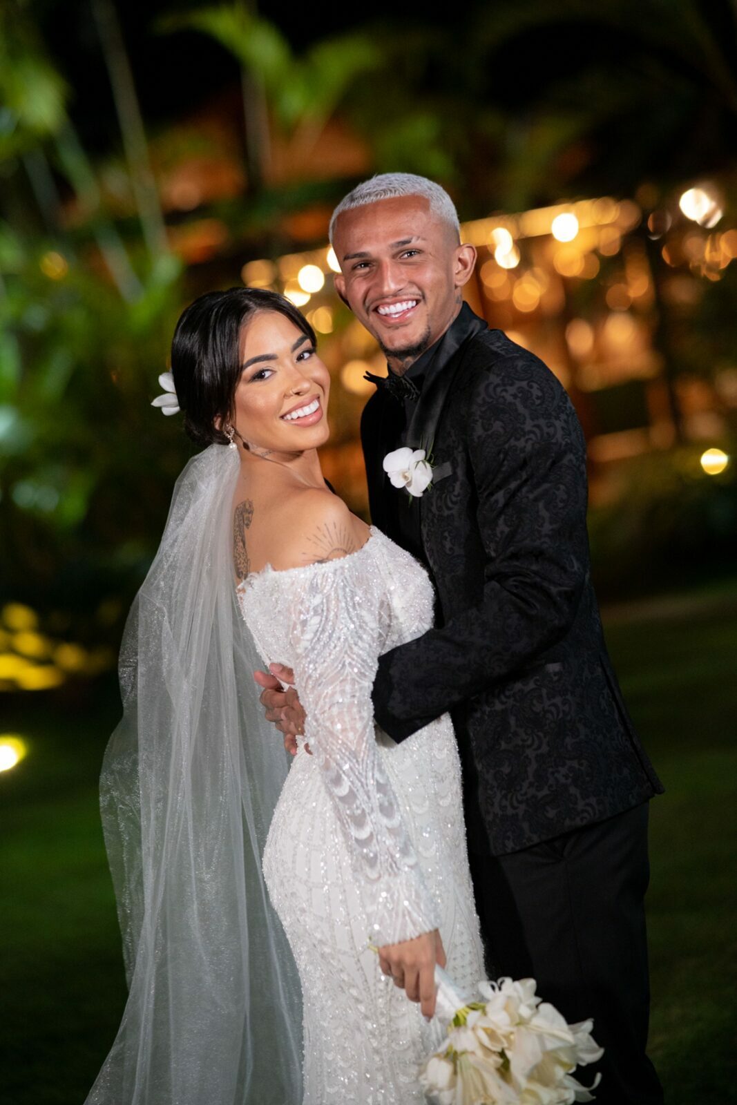 "E fomos felizes para sempre", escreveu Amanda ao publicar algumas fotos do casório. A cerimônia simples também foi compartilhada nas redes sociais por alguns amigos do casal. Companheiro de time, Bruno Henrique e a mulher, Gisellen Ramalho, também compareceram. Outro jogador foi Gerson, capitão do Fla, que ficou emocionado e precisou até secar as lágrimas.