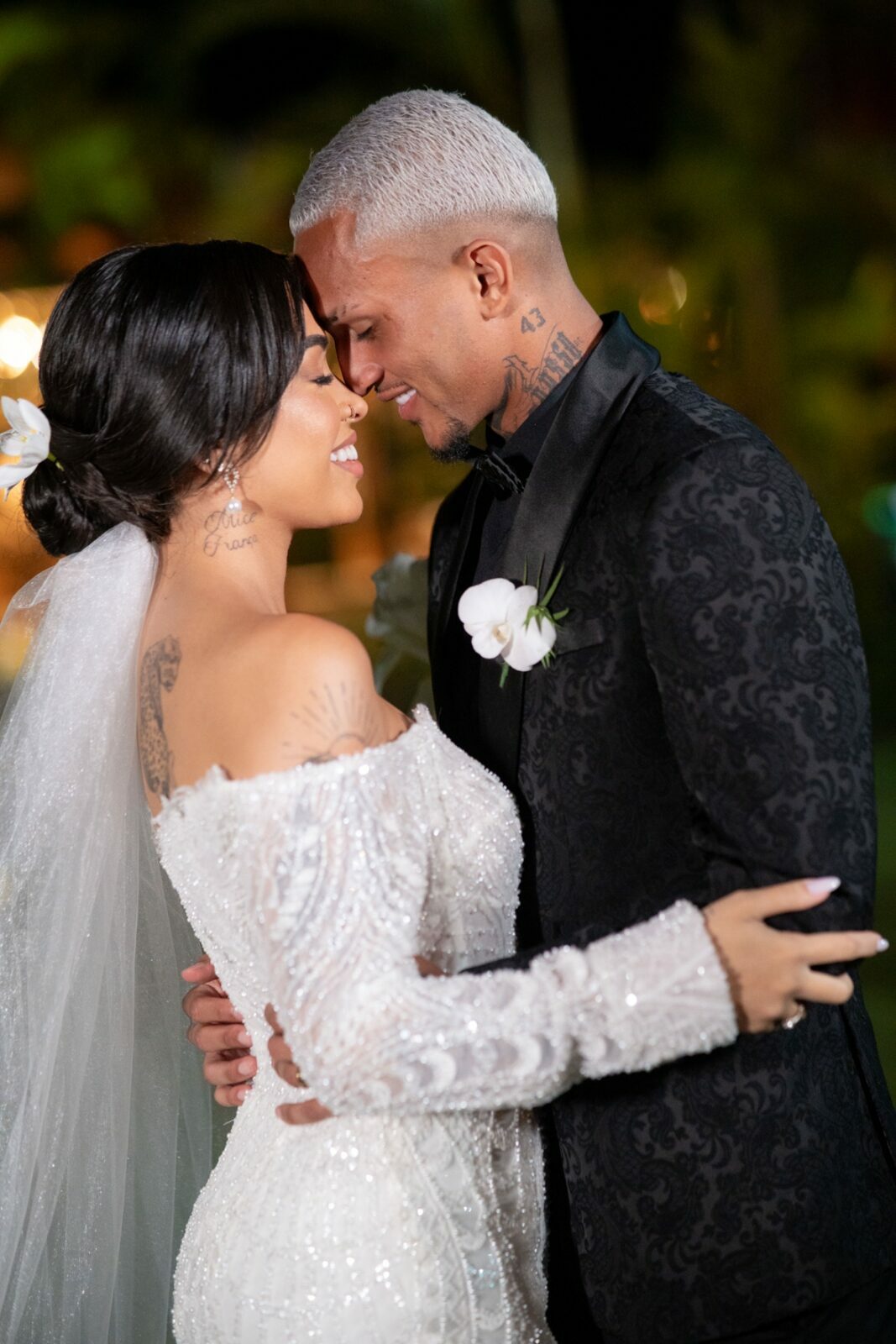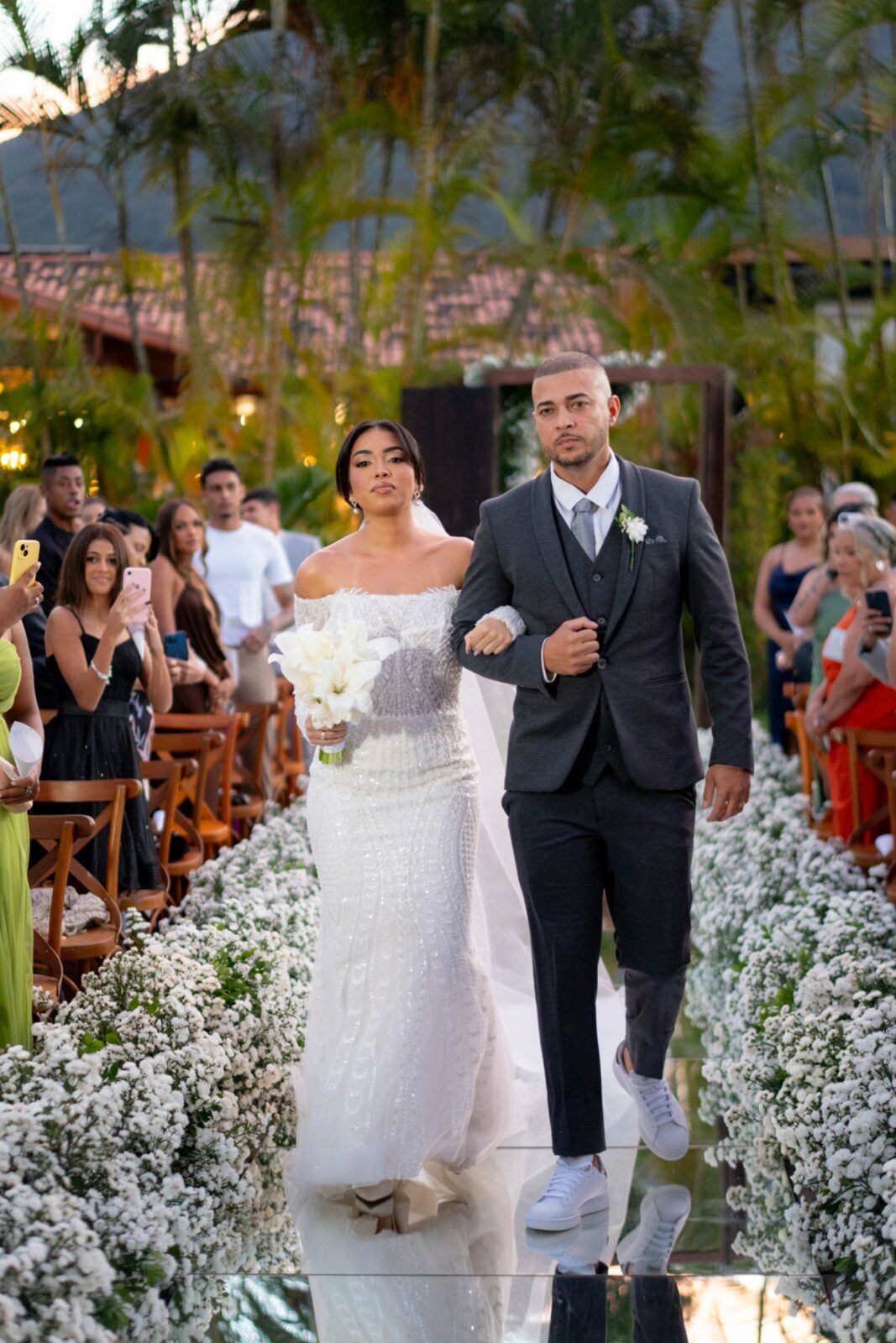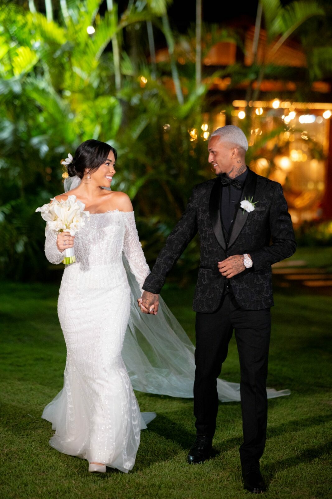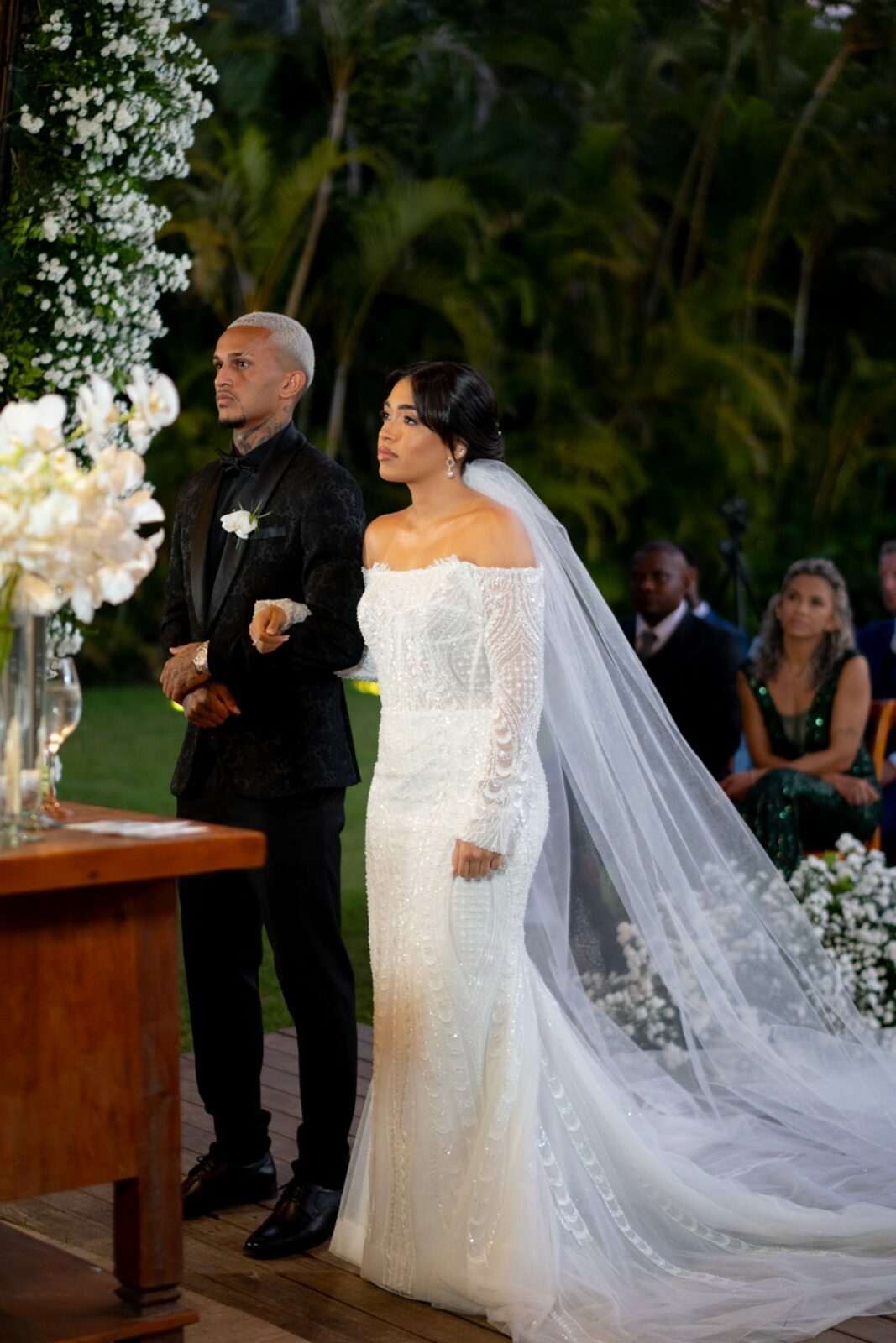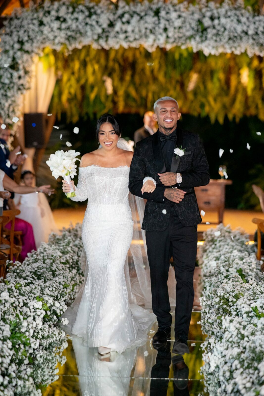 "E fomos felizes para sempre", escreveu Amanda ao publicar algumas fotos do casório. A cerimônia simples também foi compartilhada nas redes sociais por alguns amigos do casal. Companheiro de time, Bruno Henrique e a mulher, Gisellen Ramalho, também compareceram. Outro jogador foi Gerson, capitão do Fla, que ficou emocionado e precisou até secar as lágrimas.